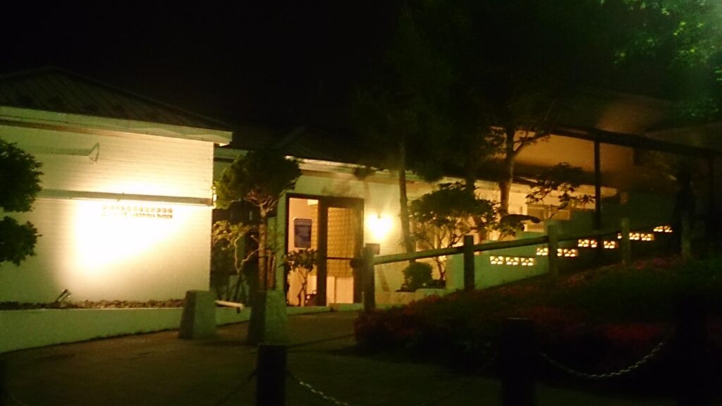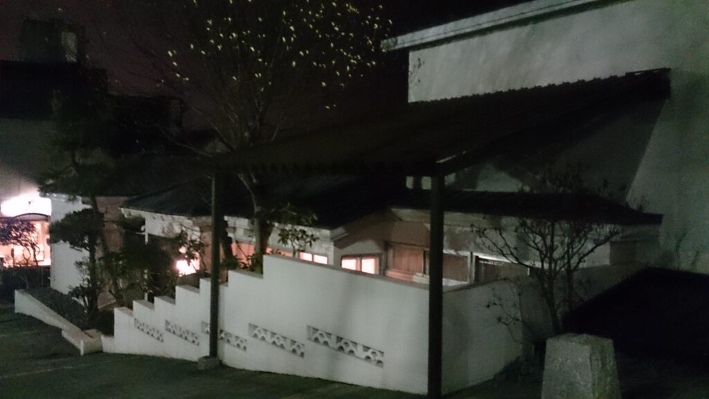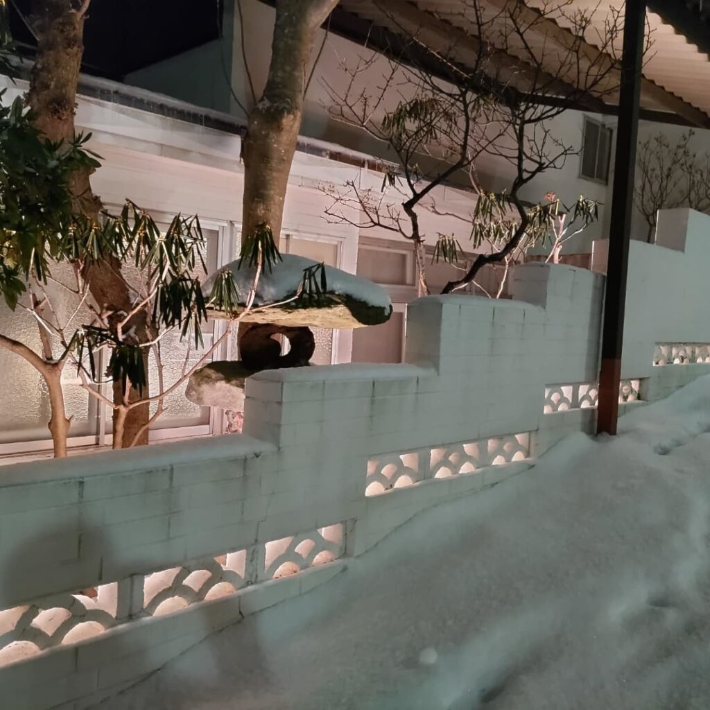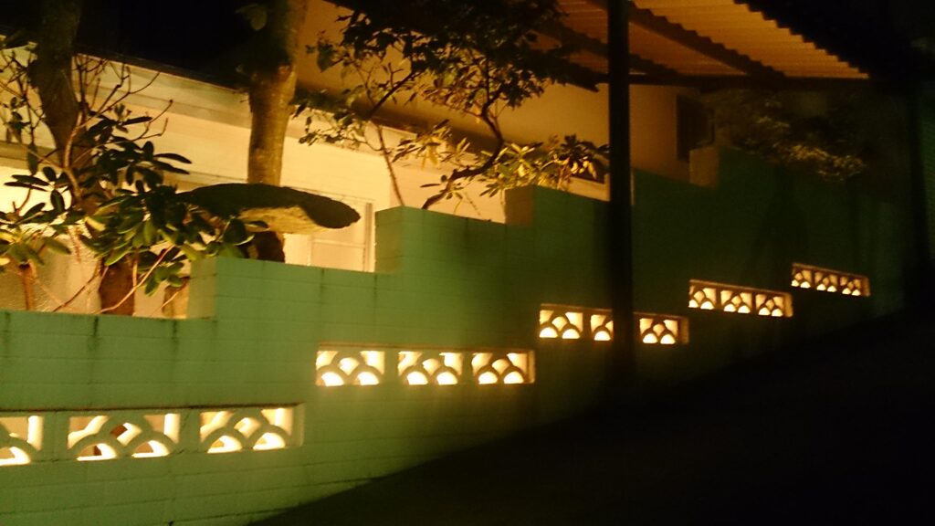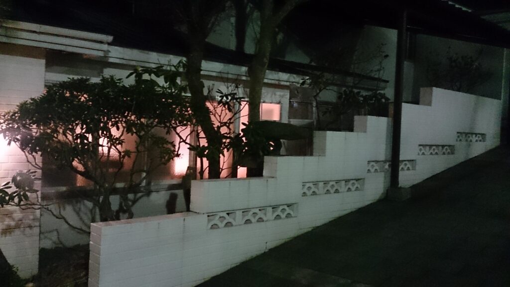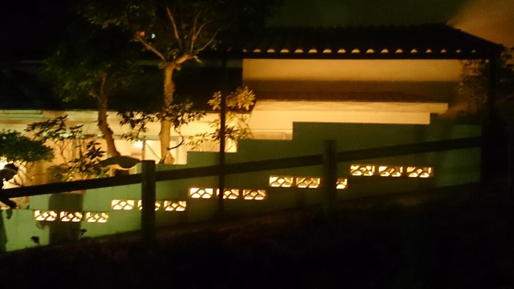 塀の装飾部分をシルエットで浮かび上がらせると同時に庭の樹木もライトアップ。