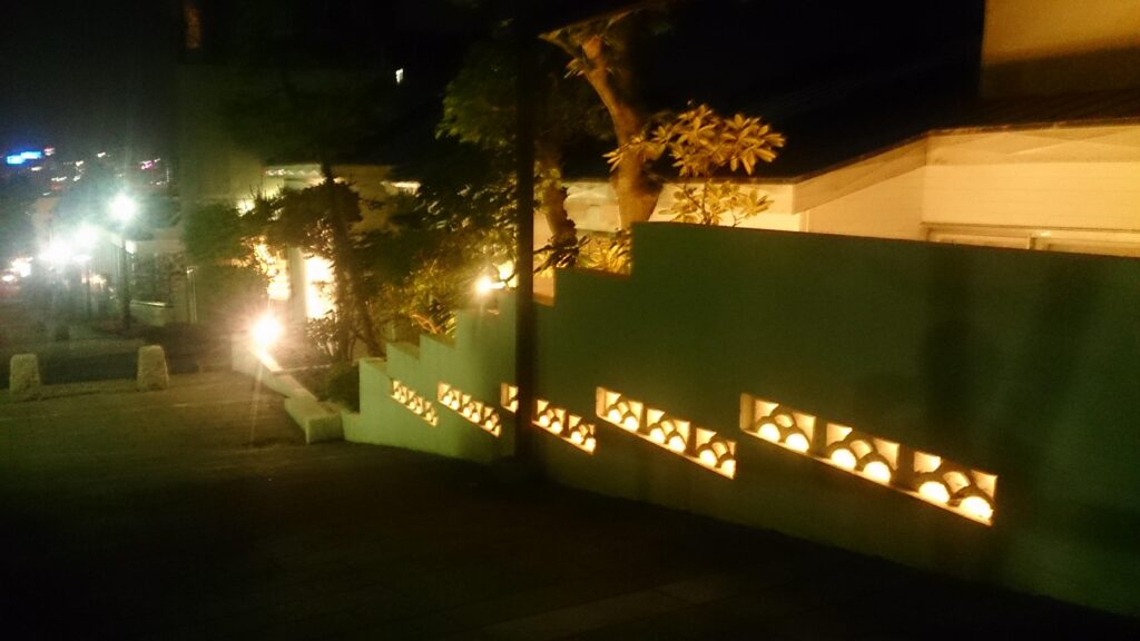 坂道になっている歩道沿いは歩行者の邪魔になり器具が設置出来ないため、塀の裏側に照射方向が調整できる器具を設置。