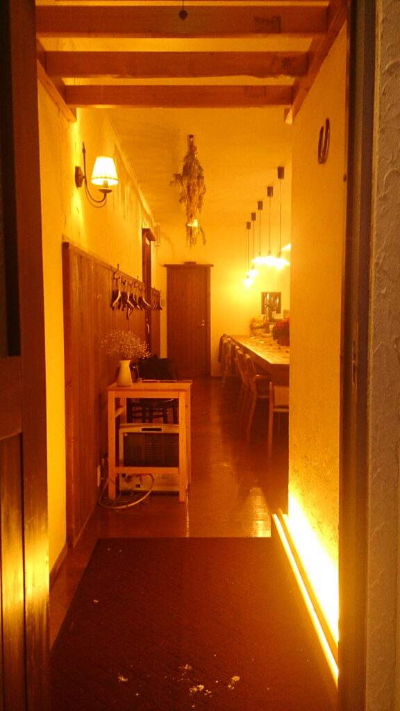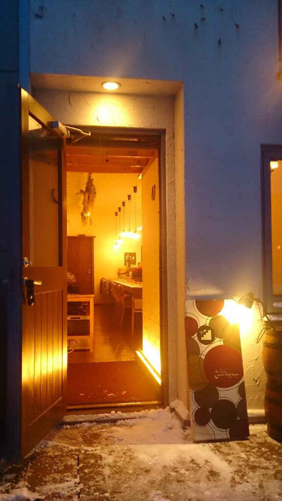 雪景色の中、外から見ても店内からこぼれる灯りを感じ、思わず入ってみたくなるような温かさを感じるイメージで照明プランをしました。