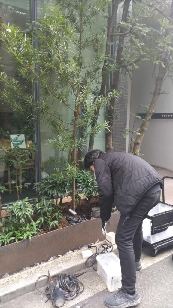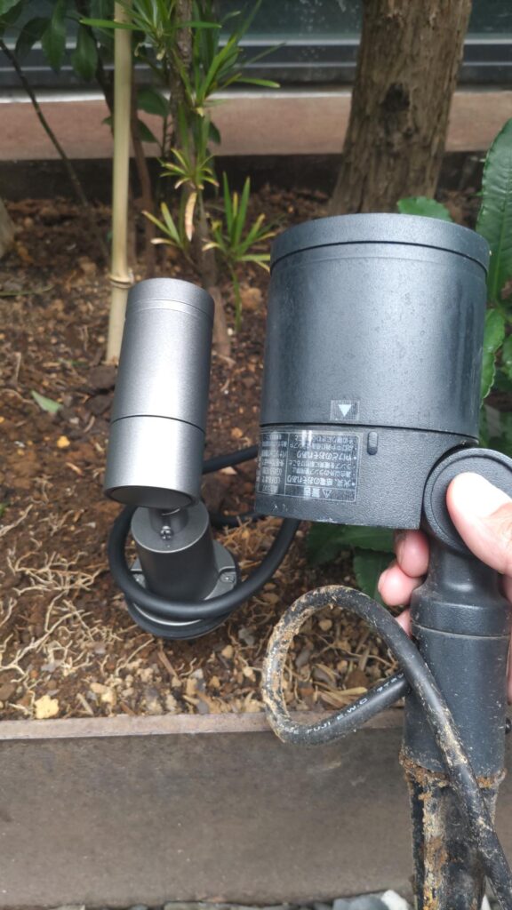 照明を設置する植え込みスペースが狭いため、器具の存在が目立たぬよう見た目を考慮してコンパクトサイズのスポットライトを設置。