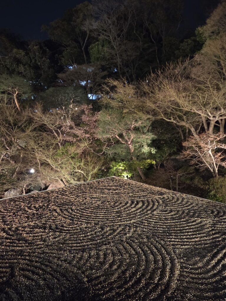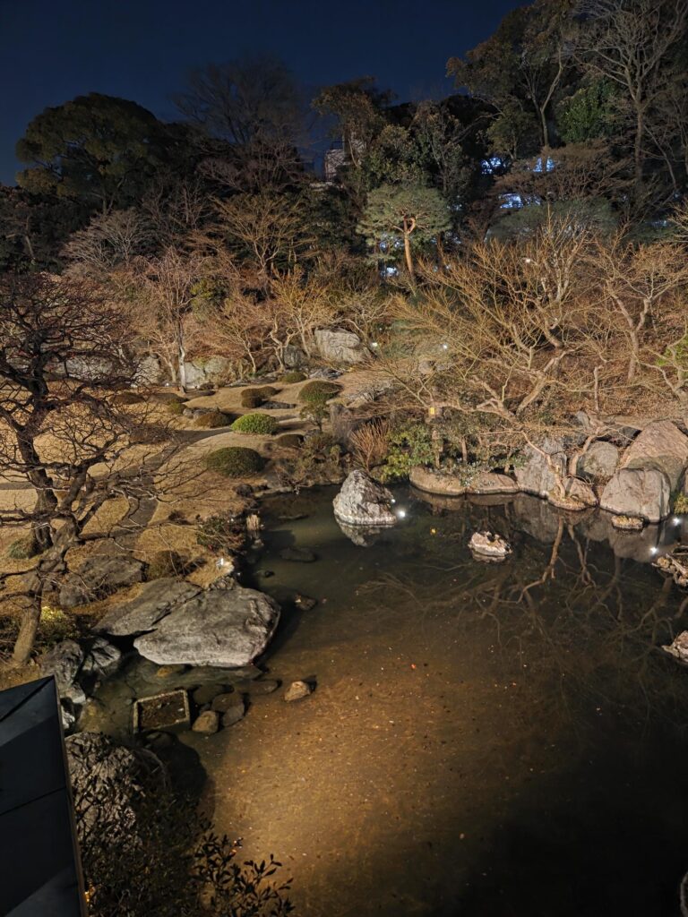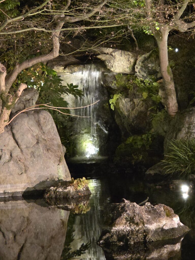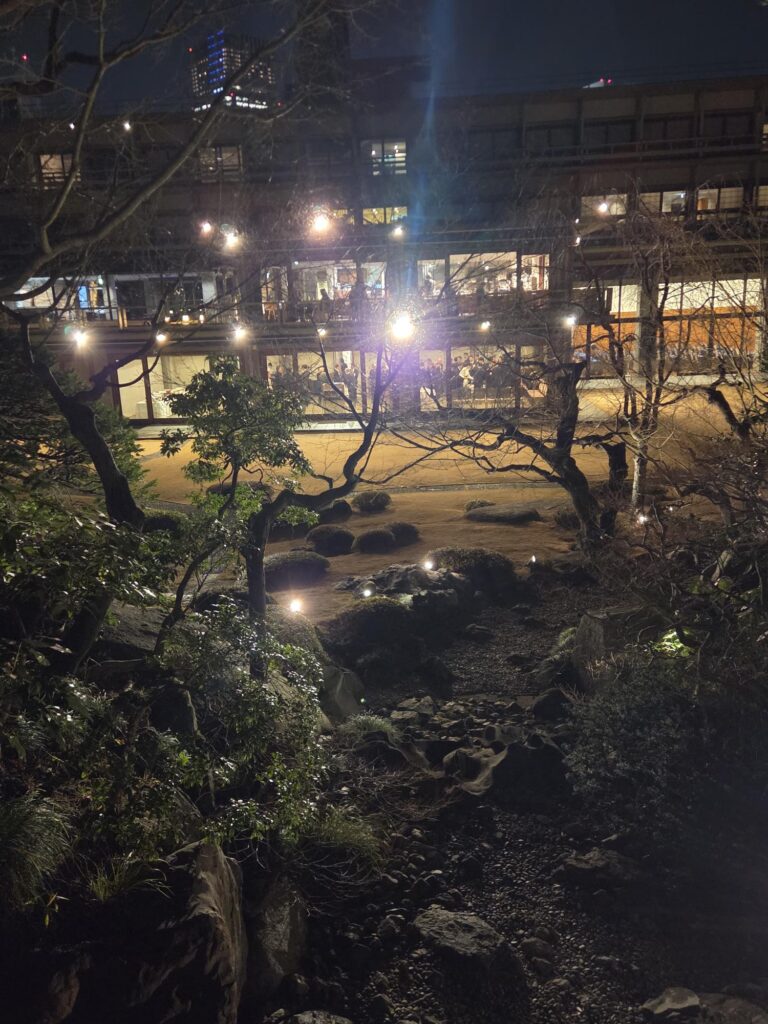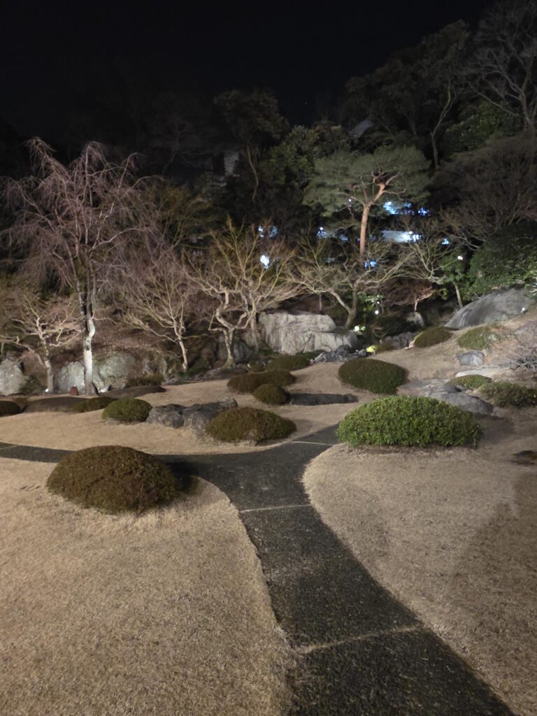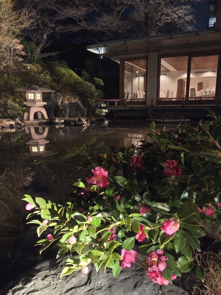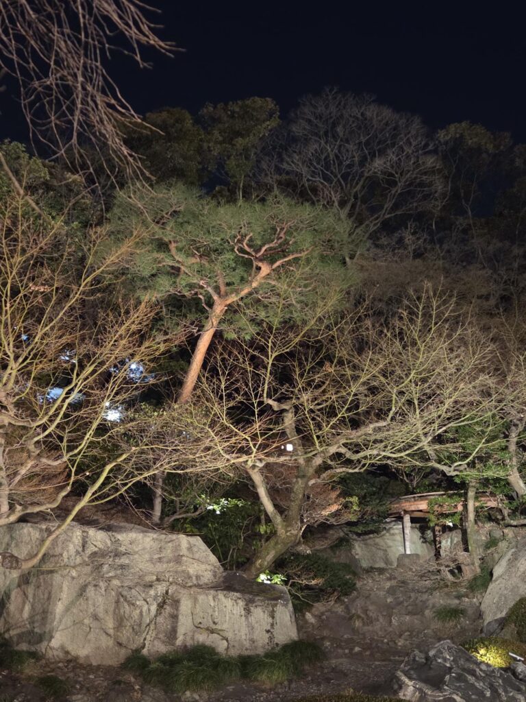 この「前川石」に立ち本館を眺めると、スポットライトの光が点々ときらめいて見える景色がまた美しく、夜ならではの好きな風景です。