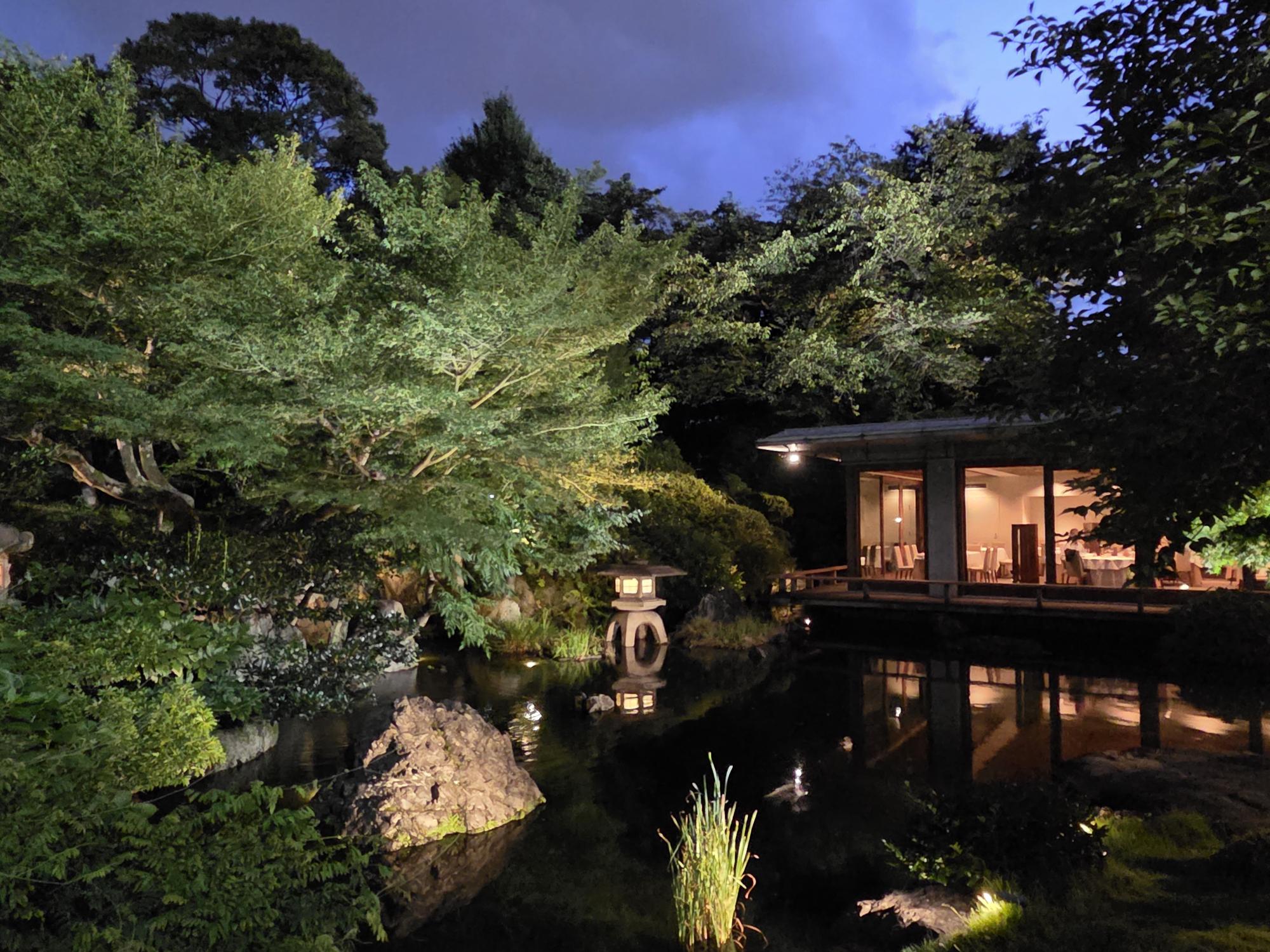 まもなく世間がお盆休みに入る夕暮れ時の庭園。 木々の葉が一層ボリュームが増して緑が庭一面に広がっています。