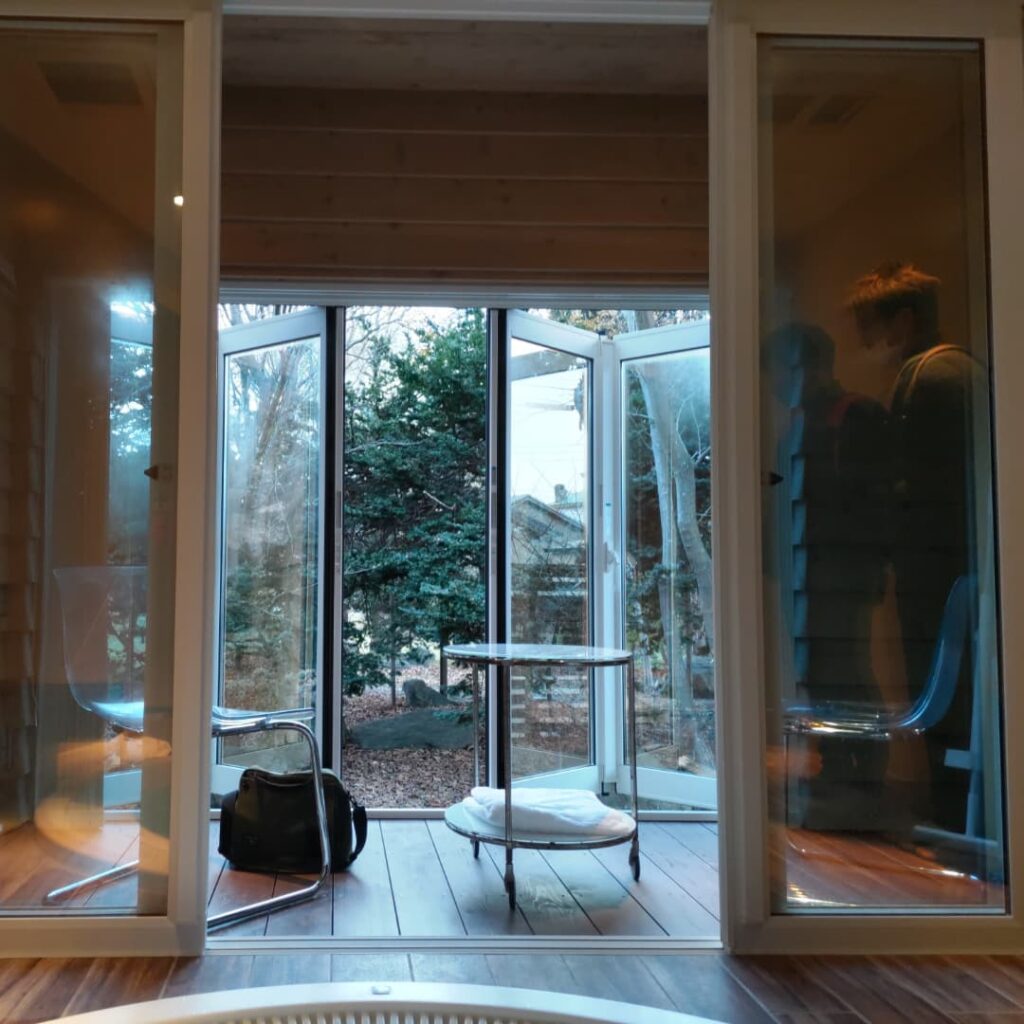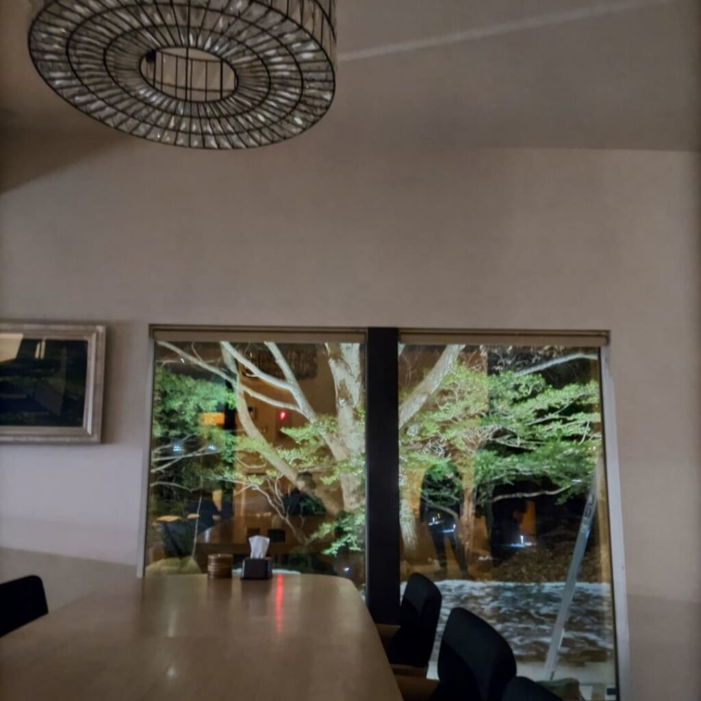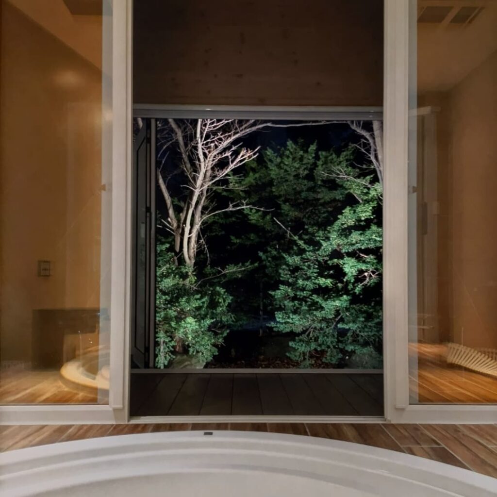 温泉に入りながら見える景色は額縁越しの絵のようにライティング。