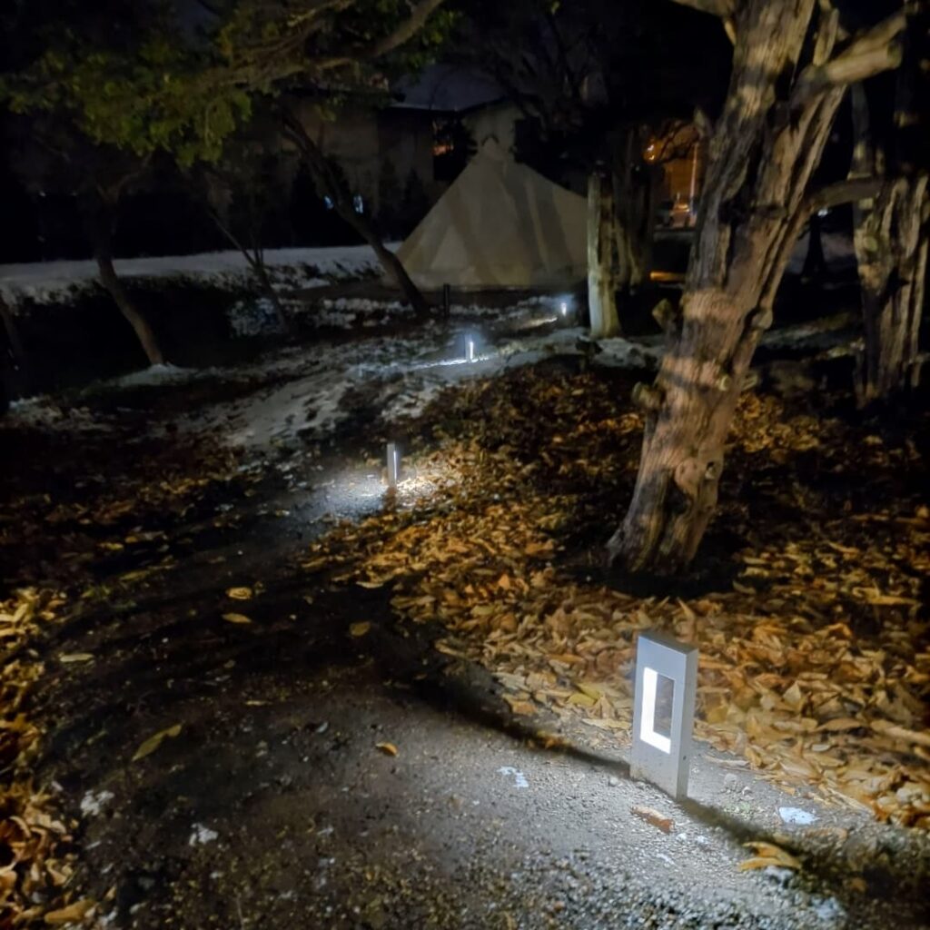 庭園の奥へ続く遊歩道には足元を間接光で照らす低めの庭園灯を設置。