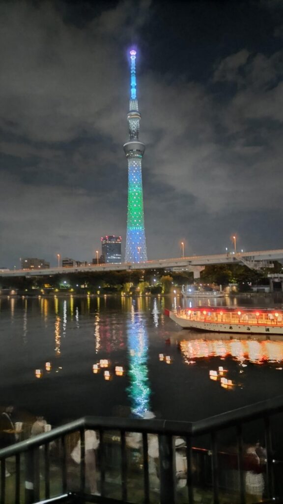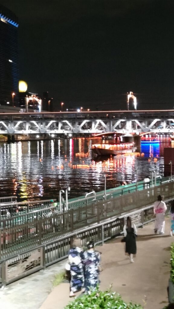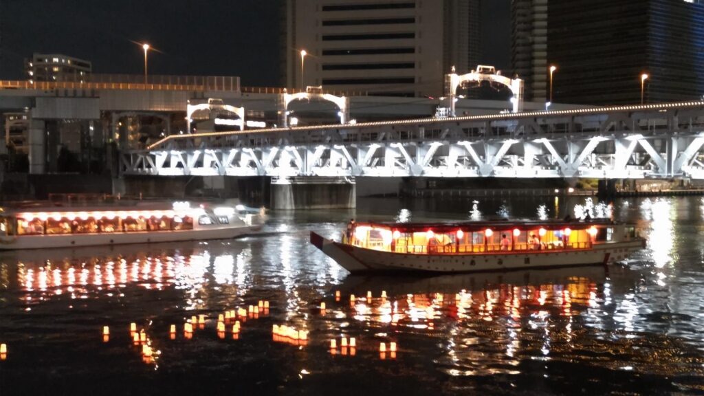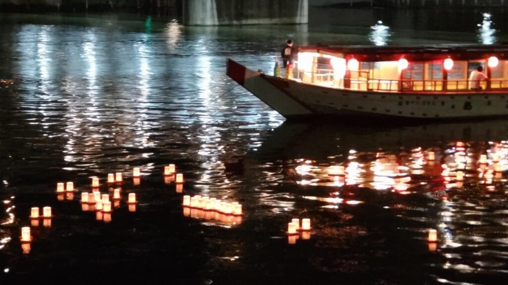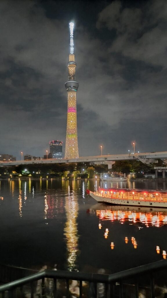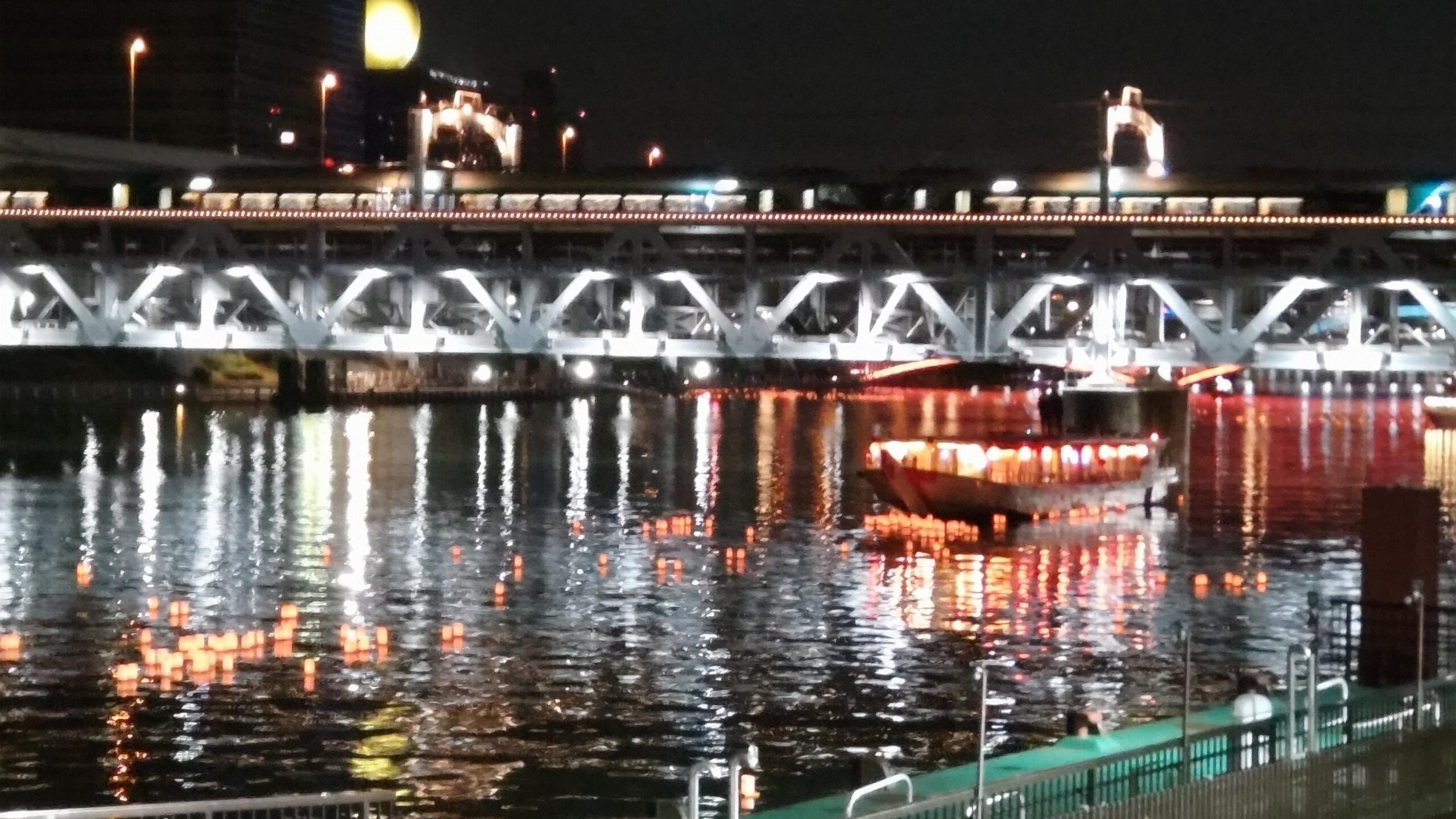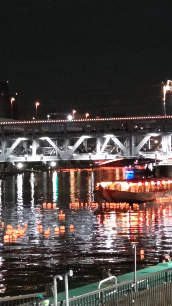 隅田川とうろう流し 2025 12/25 2024年8月17日2025年12月25日 2024年8月10日(土) 今年の夏は猛暑続きで毎日汗だくでタオルが手放せません。陽が落ちて少しだけ涼しくなる夜に隅田川のとうろう流しを見てきました。川面を静かに流れる灯籠と屋形船の灯りが水面に映り込んで綺麗でした。 結婚記念日のお祝い 朔日参り【9月】 関連記事 【9月】朝 活 2025年9月1日 庭園照明の調整 2025年8月25日 一年ぶりの奈良 2025年8月25日 大沼ドライブ 2025年8月22日 函館名物『いか踊り』 2025年8月21日 港まつり 花火大会 2025年8月19日 函館帰省 2025・夏 2025年8月19日 三社祭 2025年5月26日