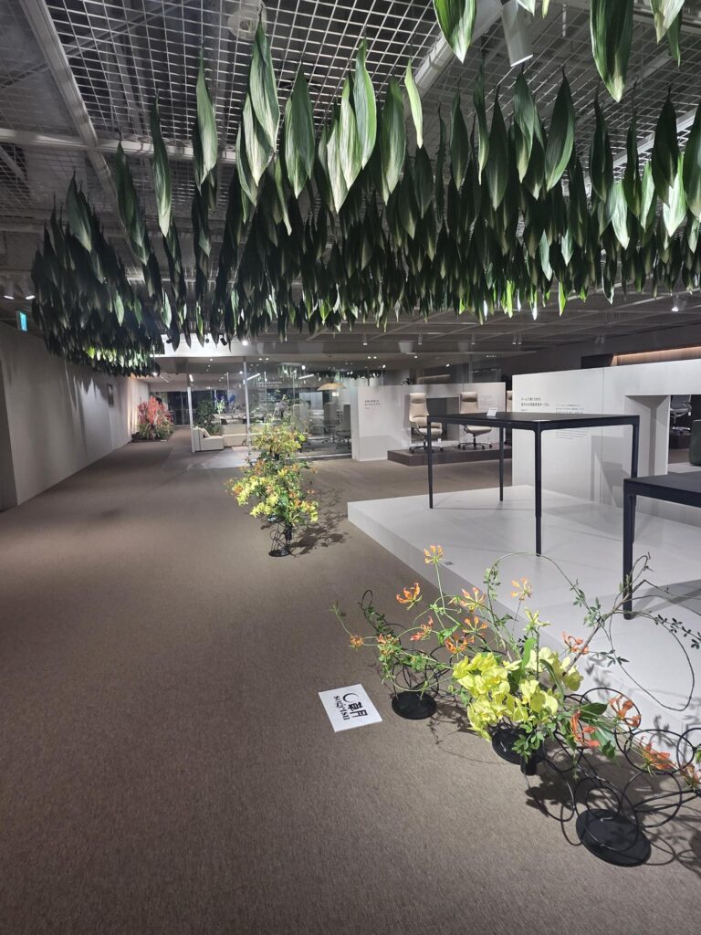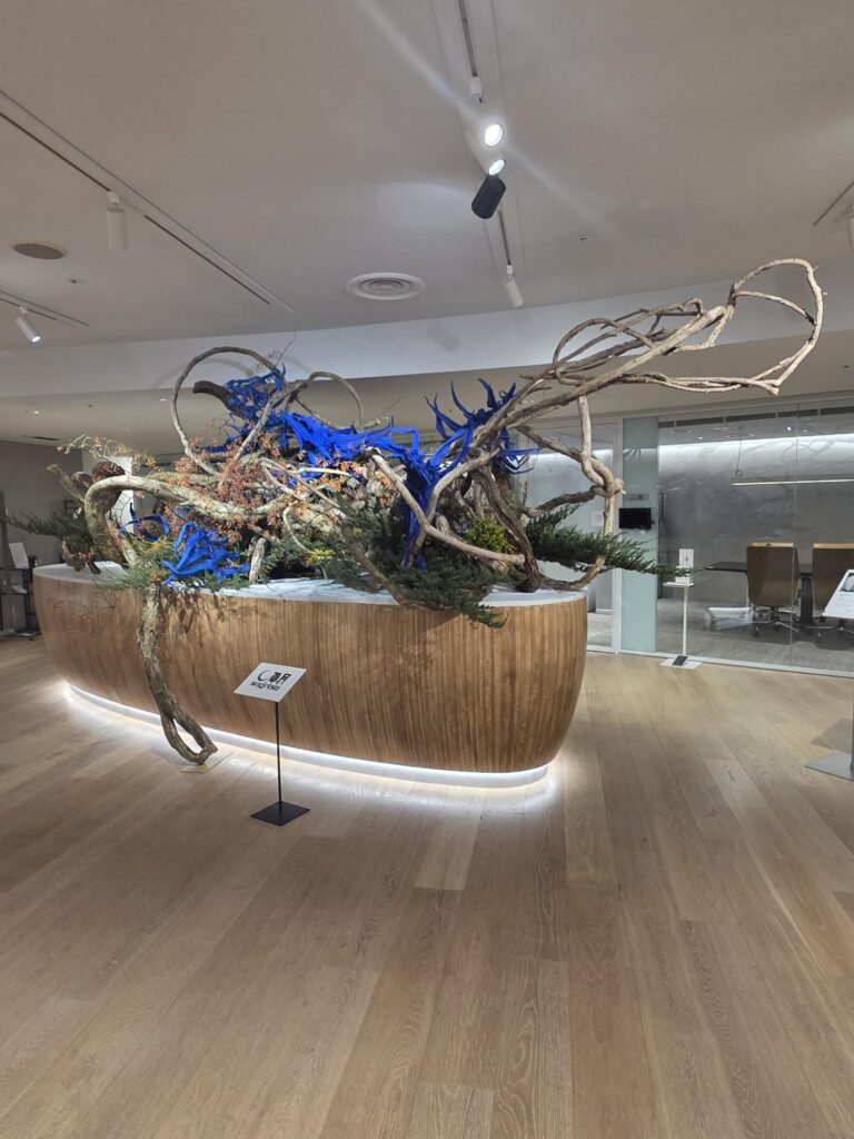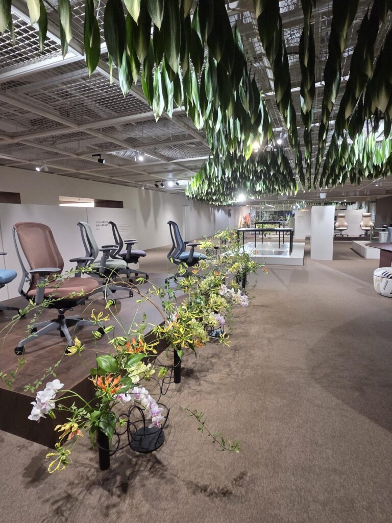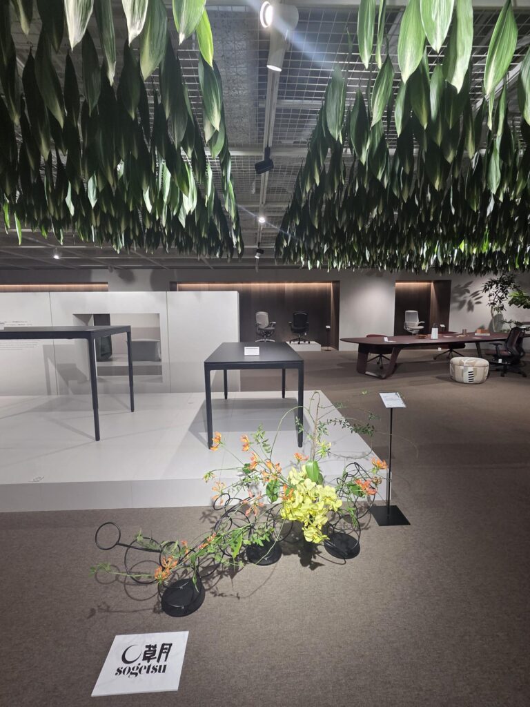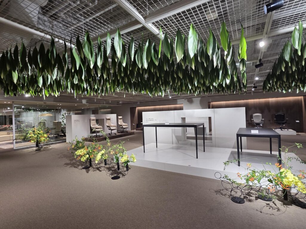 オカムラのオフィス家具製品が展示されているリニューアルしたばかりの広々としたモダンなショールームに、生花や竹、鉄、アクリルなど様々な素材を使いアレンジされた和の格調高い作品の数々が展示されました。