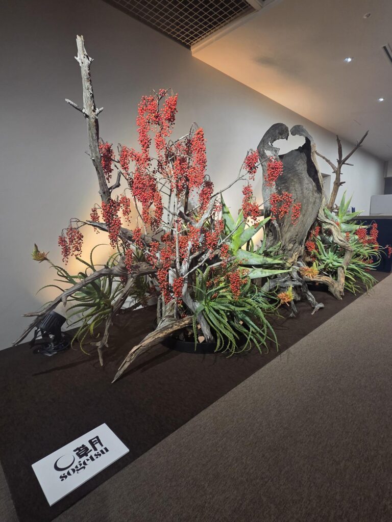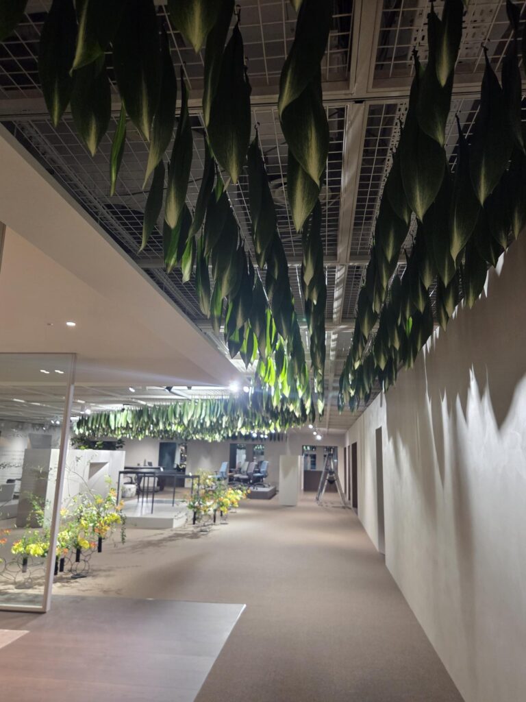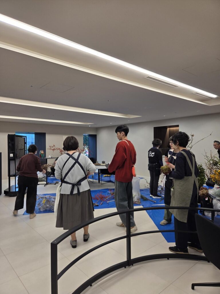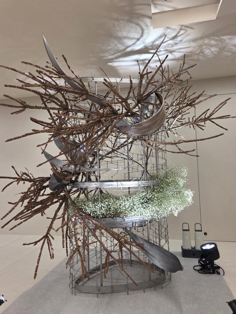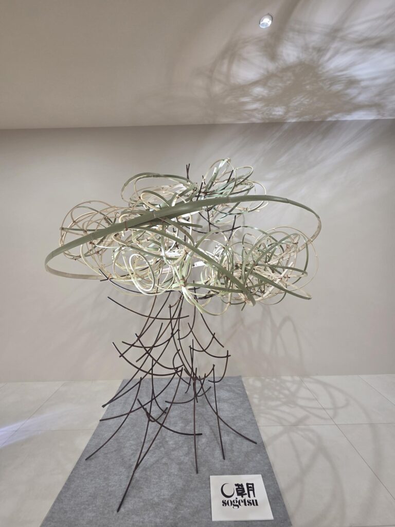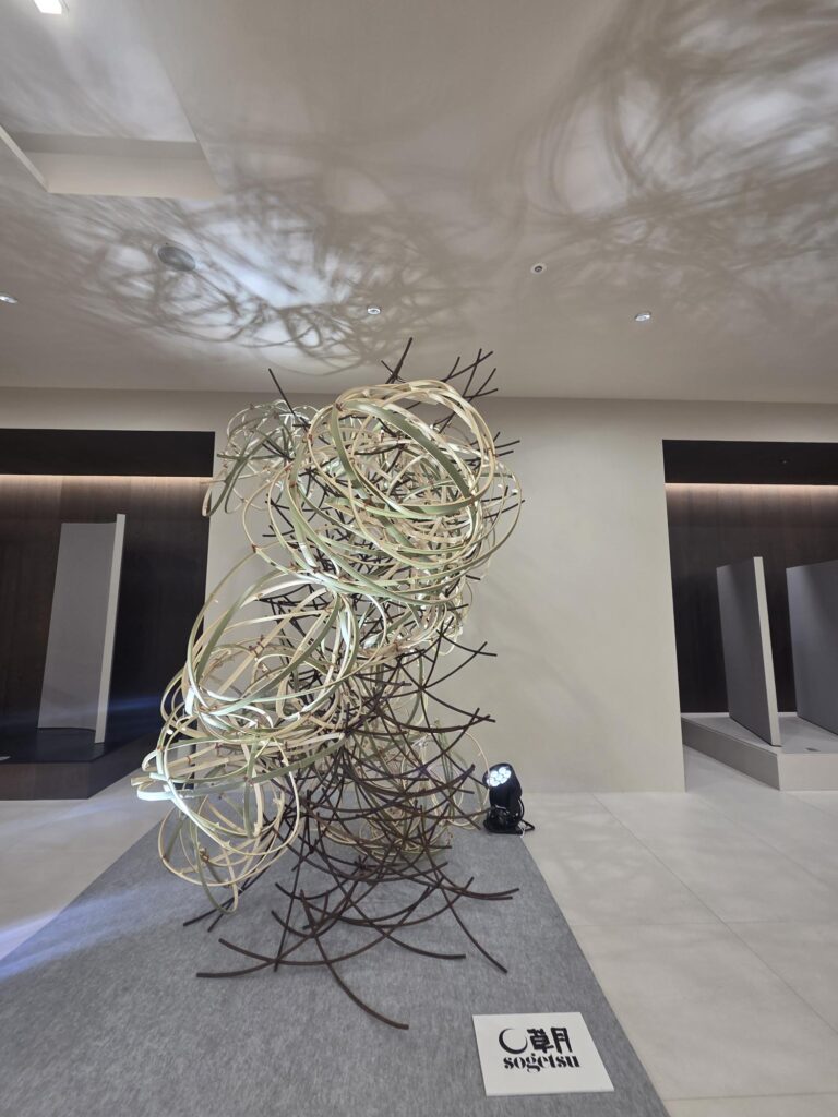 オカムラのオフィス家具製品が展示されているリニューアルしたばかりの広々としたモダンなショールームに、生花や竹、鉄、アクリルなど様々な素材を使いアレンジされた和の格調高い作品の数々が展示されました。