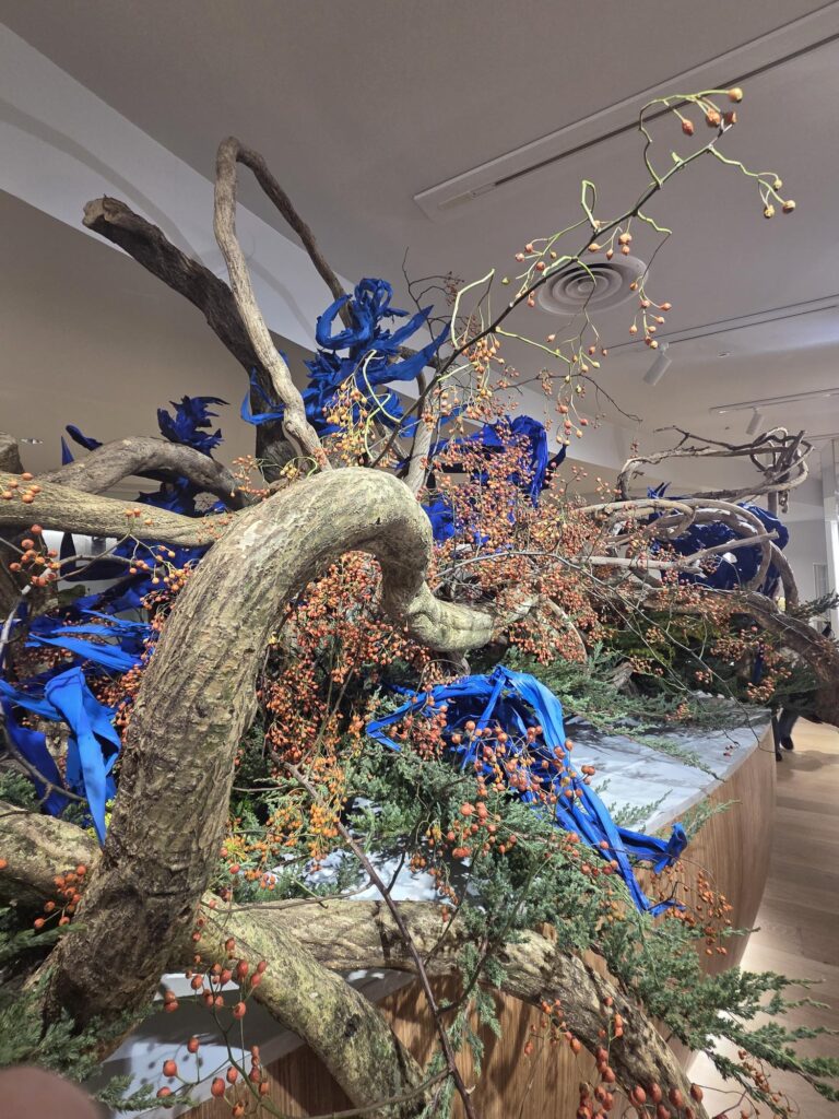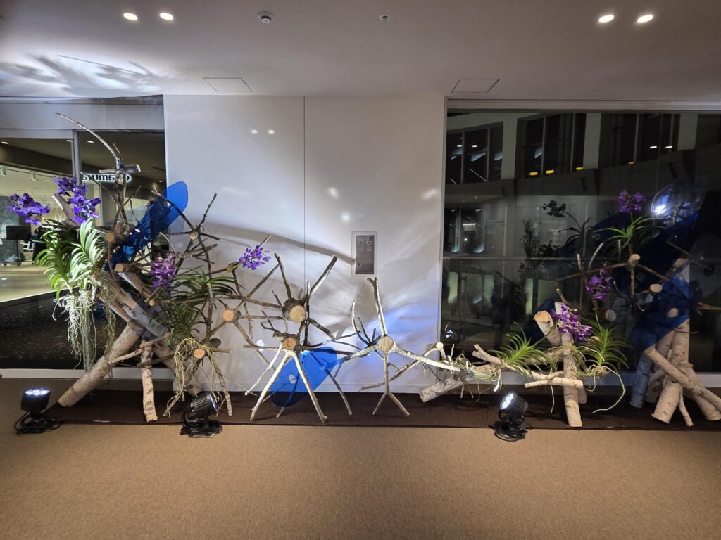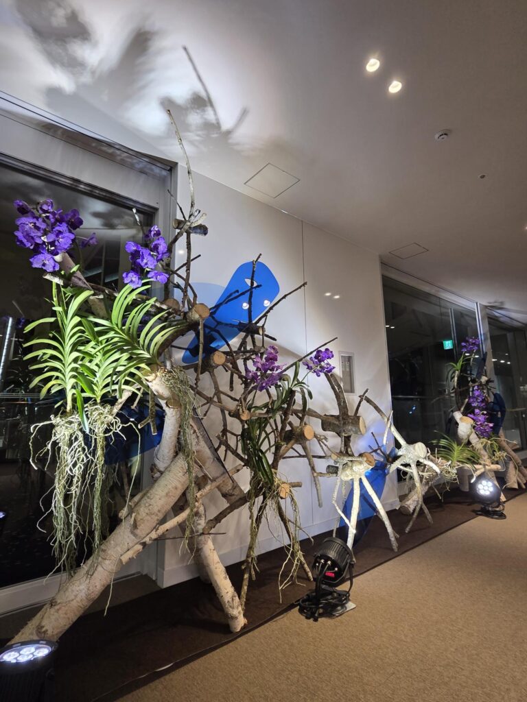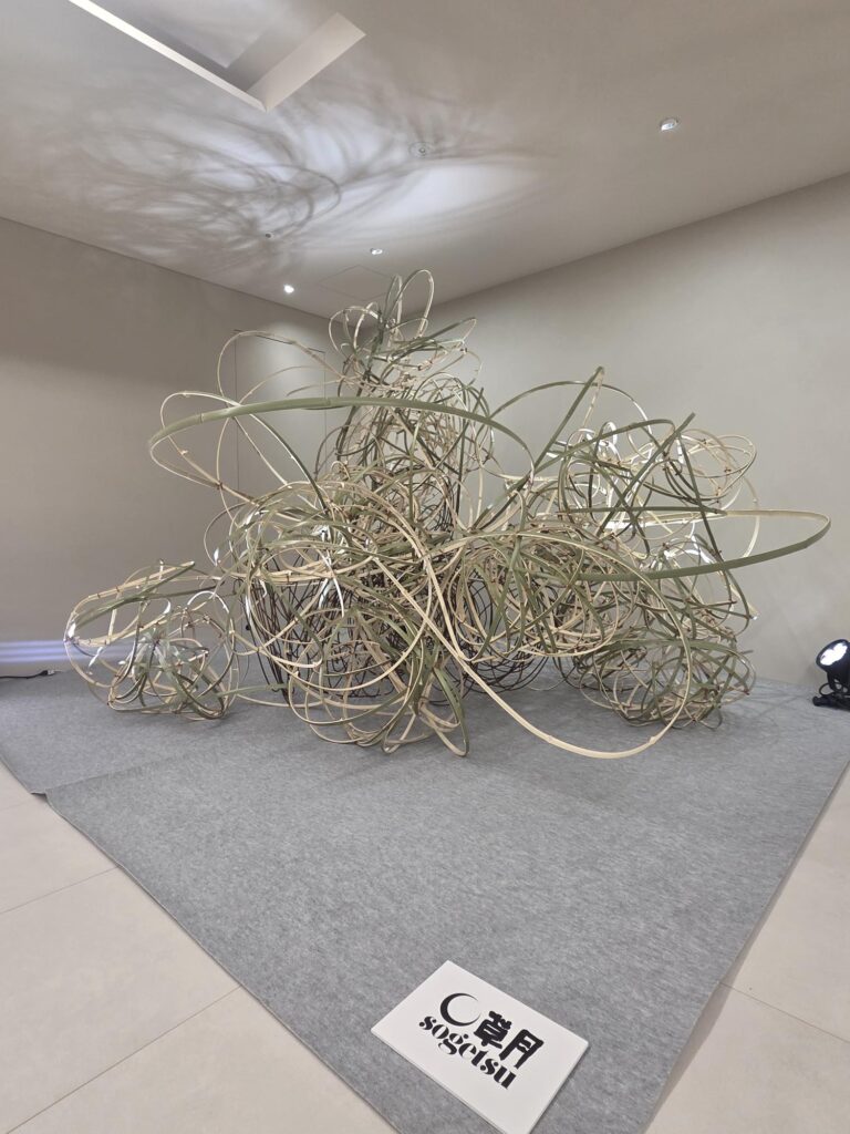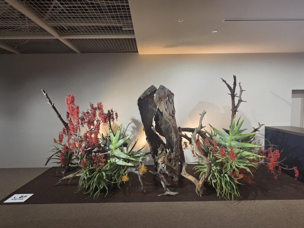 オカムラのオフィス家具製品が展示されているリニューアルしたばかりの広々としたモダンなショールームに、生花や竹、鉄、アクリルなど様々な素材を使いアレンジされた和の格調高い作品の数々が展示されました。