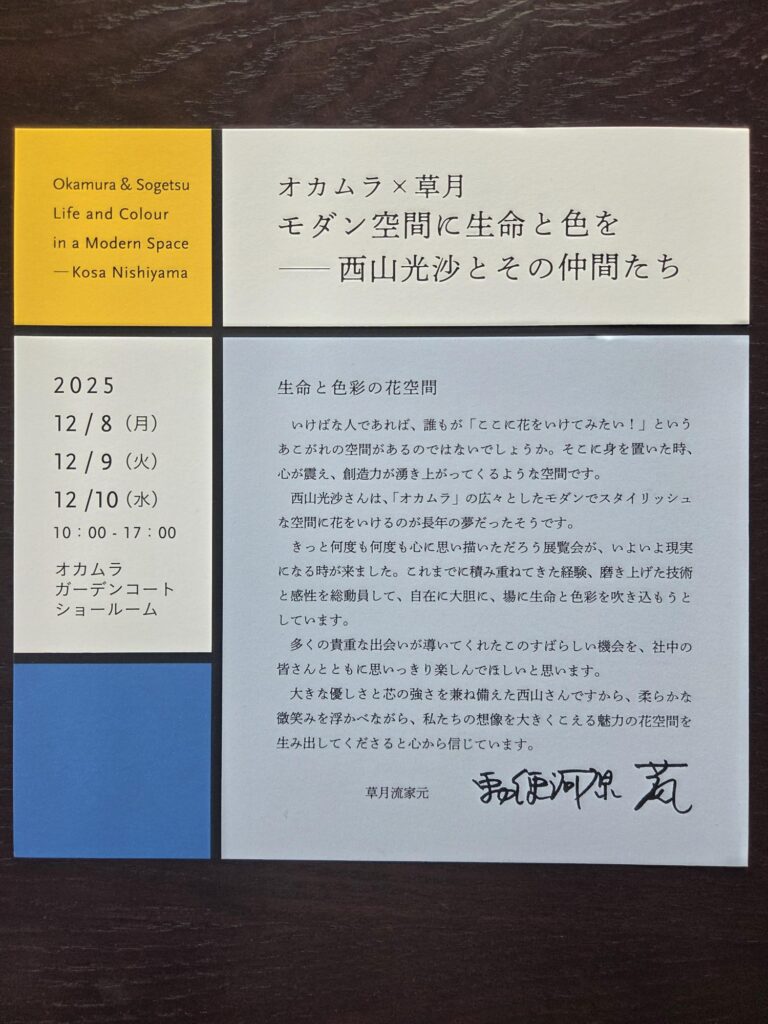 草月流のいけばな展『オカムラ×草月 モダン空間に生命と色を~西山光沙とその仲間たち』(12/8~10)の照明デザインを担当しました。
