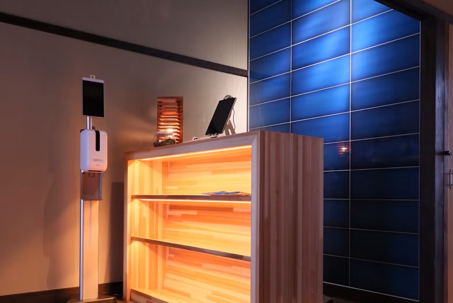チェックインカウンターの背景のブルータイルにおいては、白色光のほうがブルーがより鮮やかに引き立つので色温度4000Kのスポットライトを使用し、天井から外光が射し込んでいるイメージでライティングをしています。