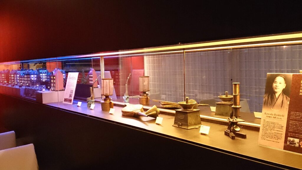 1Fのカフェにある川田龍吉男爵にまつわる資料が展示がされているウィンドウーの照明。