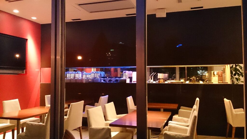 スコットランド・グラスゴーの街のジオラマエリアは、窓灯りと夜の街並みが美しく見えるように。